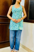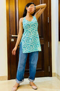 Refresh your summer wardrobe with this Sky Blue Halter Neck Cotton Kurti featuring a trendy all-over print. we Designed , this sleeveless kurti with flattering halter neckline with tie-up back, giving it a modern twist. The long straight silhouette with side slit makes it perfect for pairing with jeans, trousers, or palazzos.