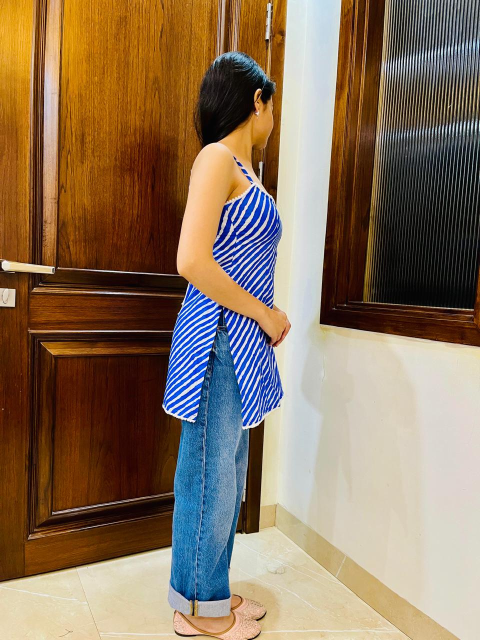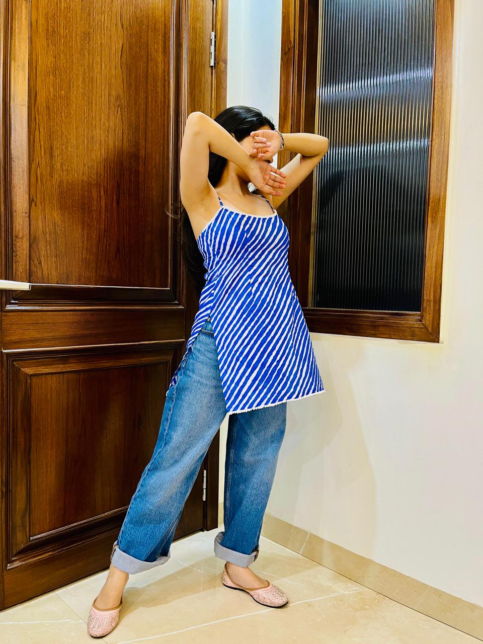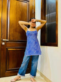 Refresh your ethnic wardrobe with this stunning Blue Lehriya Kurti Crafted from breathable pure cotton, the navy blue kurti features intricate white lehriya prints and a scoop neckline enhanced with lace detailing. Styled with a matching white cotton palazzo, this set offers a balanced blend of traditional design and modern.