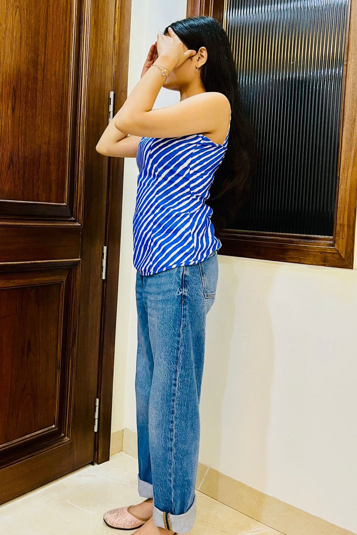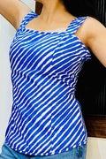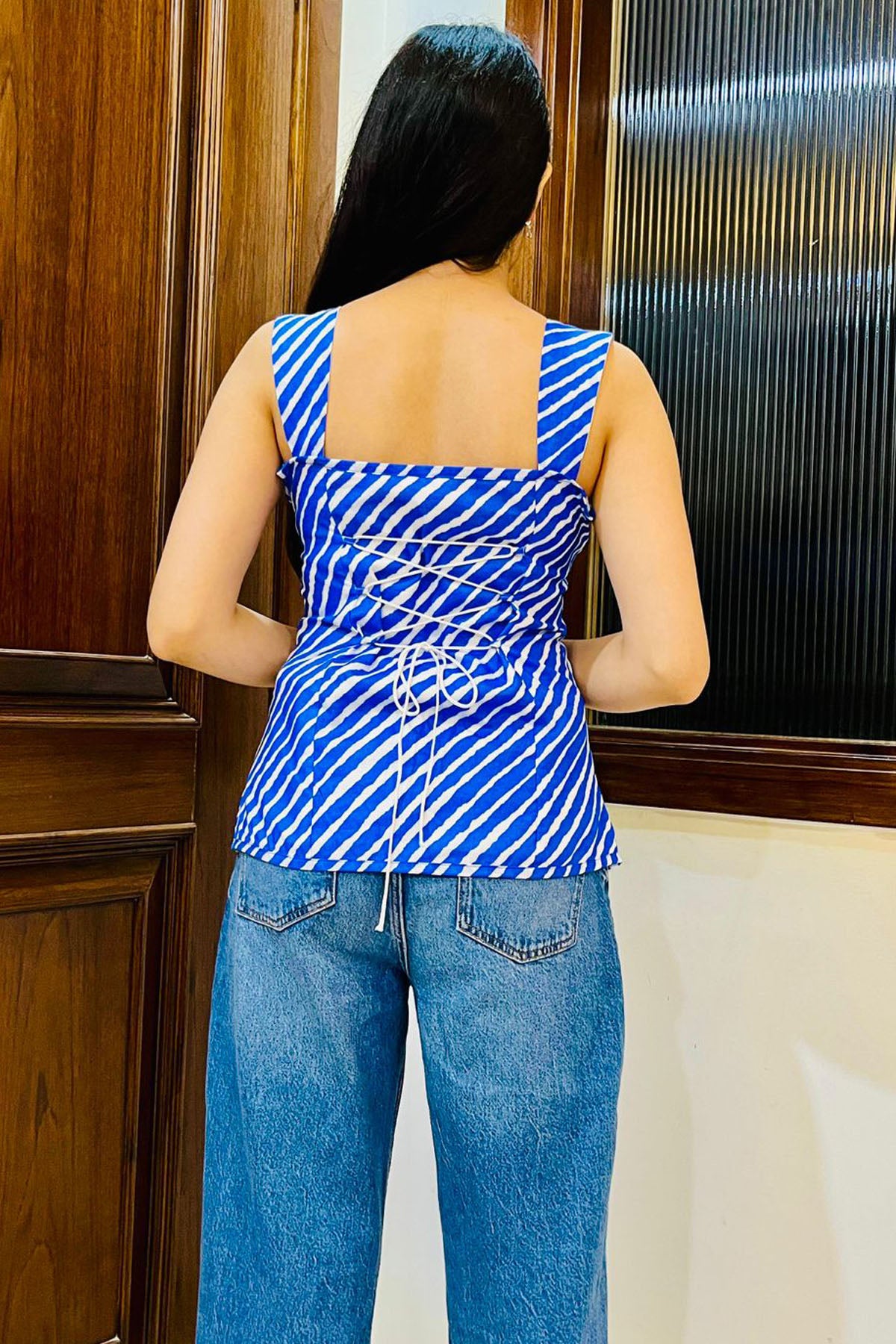 Turn heads with this bold blue diagonal stripe corset kurti featuring a structured square neckline and thick shoulder straps for a flattering fit. Designed with a lace-up back for adjustable cinched silhouette, this piece offers a sleek contouring shape. Crafted to enhance waist definition, the curved hem and fitted bodice create a modern, sharp look. Ideal for festive pairings or fusion ensembles with palazzos or pants. Perfect for those who love statement-making ethnic fusion wear.