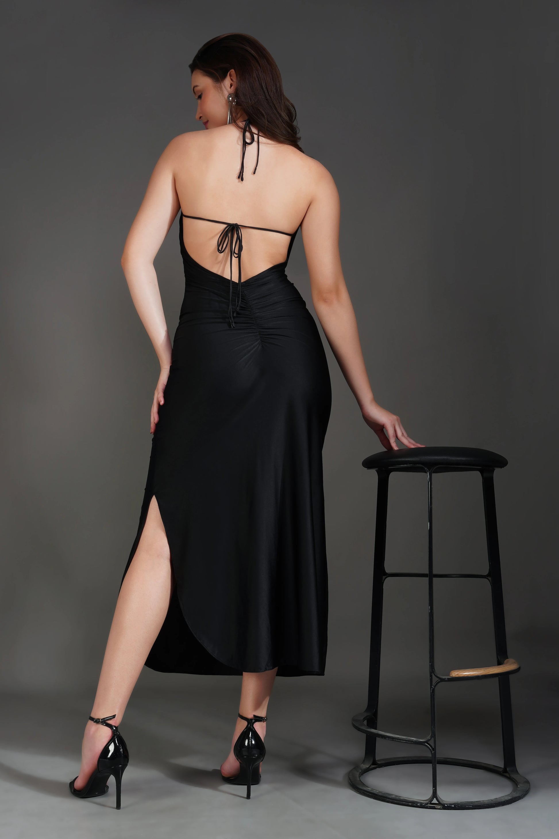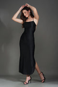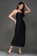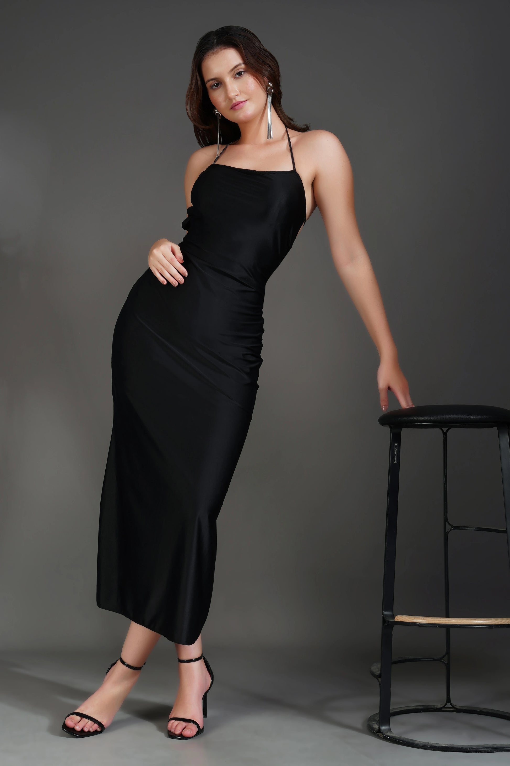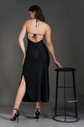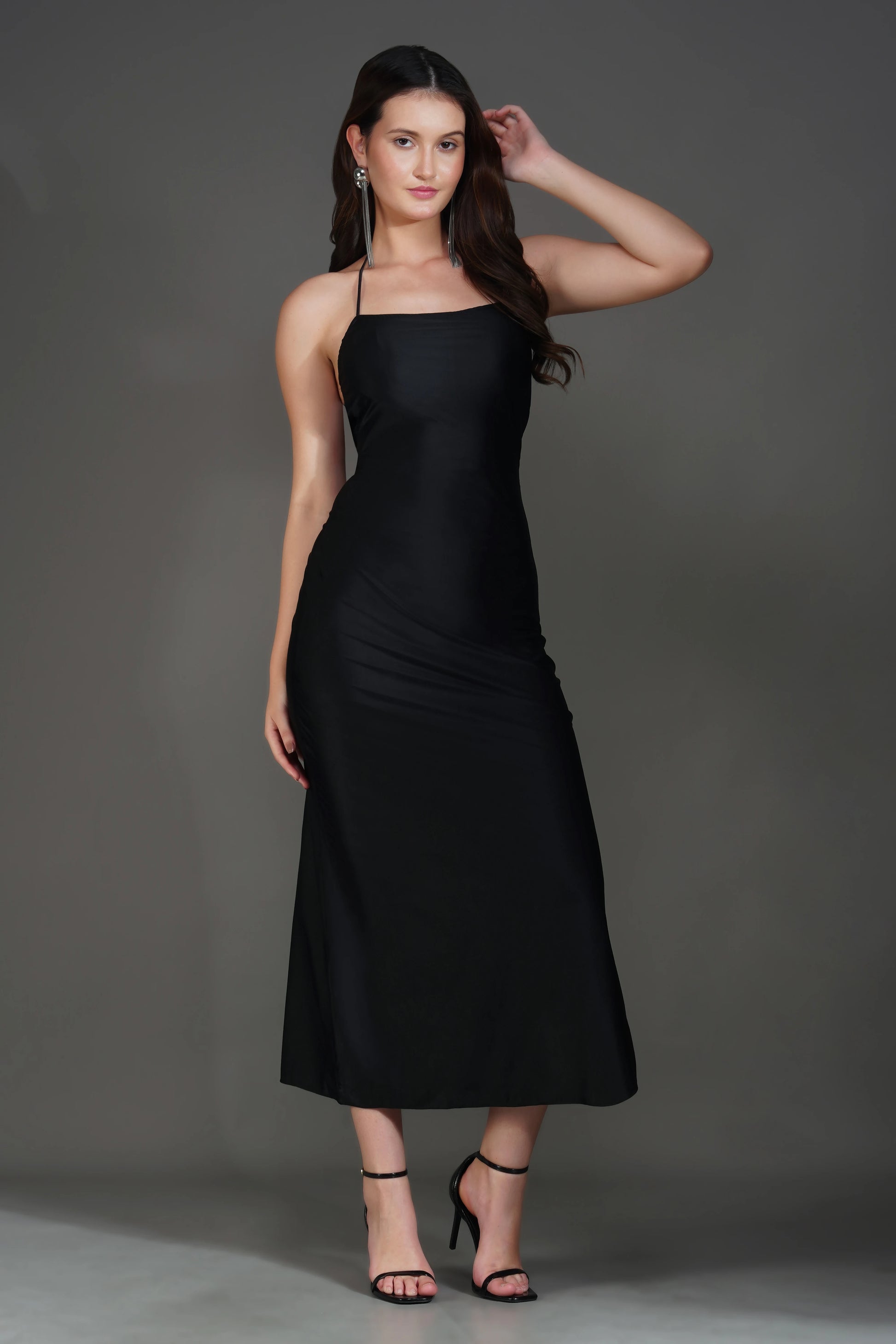 Design: Features a classic slip-dress silhouette with a halter-style thin strap neckline, a low back for added elegance, and a midi-length hemline for a timeless appeal.
