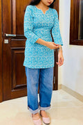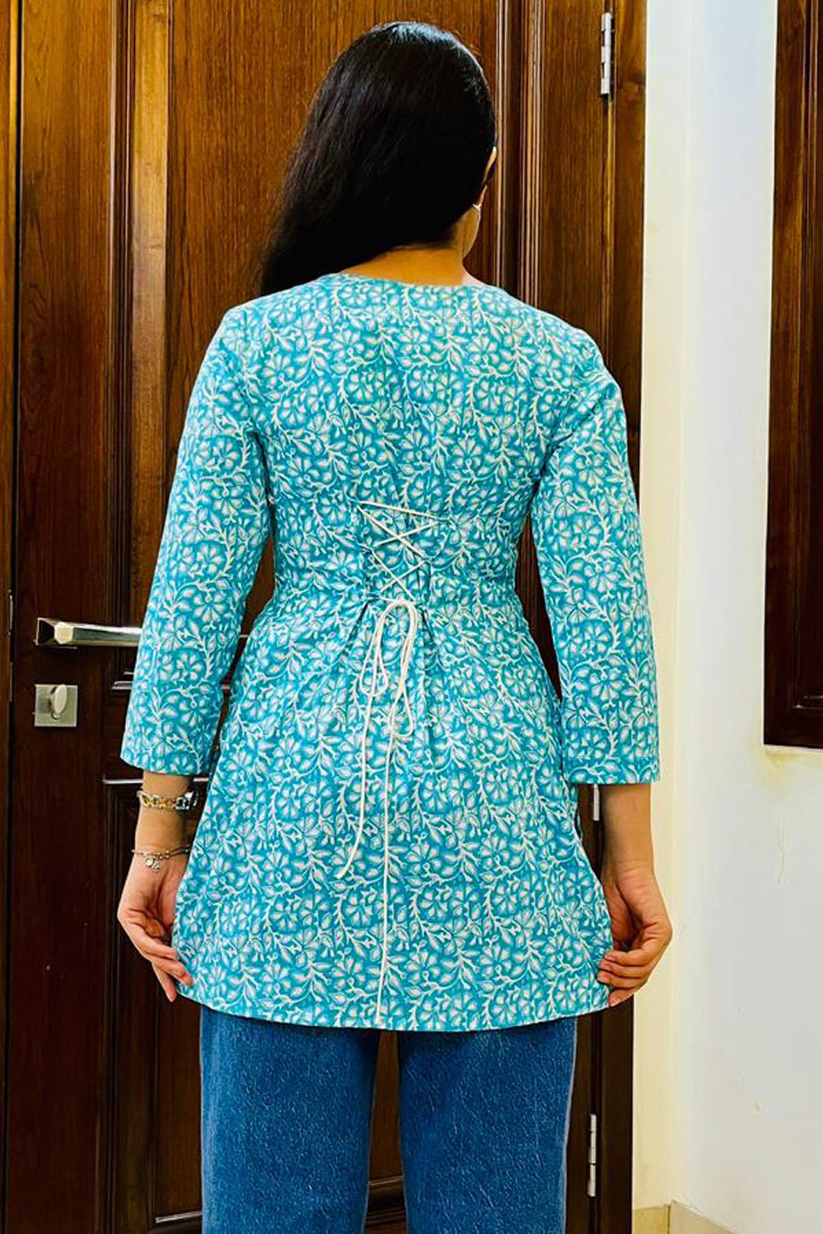 Brighten up your day to day look with this sky blue printed kurti that blends ethnic elegance with a modern twist! Crafted in breathable cotton, it features a flattering princess-cut fit, 3/4th sleeves, and a beautiful keyhole neckline. The surprise element? A unique back lace-up tie design that adds a stylish and adjustable fit while enhancing the silhouette.